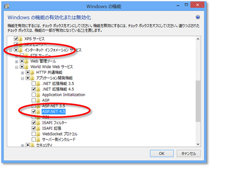 インターネットインフォーメーションサービス(IIS)をチェックして、「ASP.NET 4.5」を忘れずにチェックしておく。