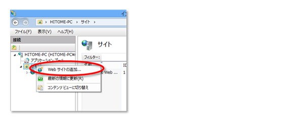IISで「サイト」を右クリックして「Webサイトの追加」で作成。