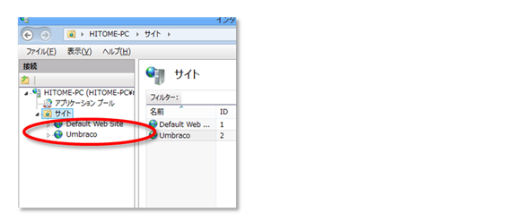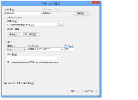 ここでは、「c:siteUmbracoCms.6.0.3」を、Umbraco という Webサイトに割り当てている。