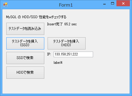 SSDにするとBlukcopyは5倍ぐらい早くなる – Moonmile Solutions Blog の比較として、MySQL では、SSD/HDD はどうなんだろうね?という話です。MySQL の Connector には Bulkcopy っぽいものがないので、ちまちまと insert しています。なので、その分遅くなるので、適当に1000件単位でトランザクション使って commit します。1件ずつ insert するよりは早いのですが、SQL Server よりは SSD 比で 10 倍ぐらい、HDD 比で 2 倍ぐらい遅いです。SSD/HDD で倍数に差がでているのは、SQL Server + SSD がむちゃくちゃ早いからですね。