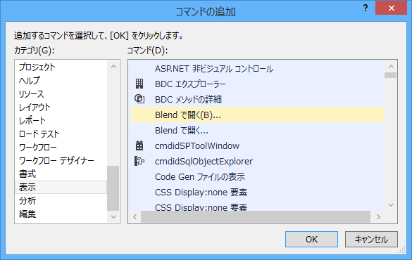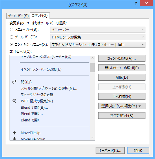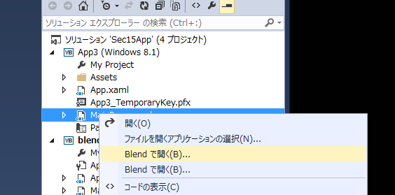 上記のVS2012で、外部ツールを使ってコンテキストメニューに追加する方法はVS2013でも有効です。なので、まあ自分で使う分にはいいか、ってところなんですが…ストアアプリのプロジェクトには「Blendで開く(B)…」があるのだから、どっかで設定はしているハズなんですよ、と思い直して探してみました。