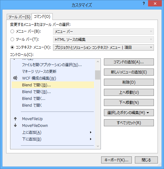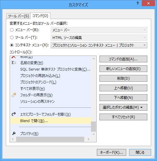プロジェクトのほうは「プロジェクトとソリューション コンテキストメニュー|プロジェクト」のほうの「Bあり」のBlendで開くを、削除→追加します。