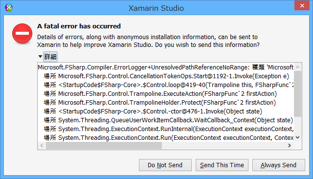 ちなみに、このソリューションを Xamarin Studio を開くと以下のようなエラーがでます。mono版の FSharp.Core を期待しているところに、MS版の FSharp.Core を入れられた訳で、仕方がないといえば仕方がないですね。