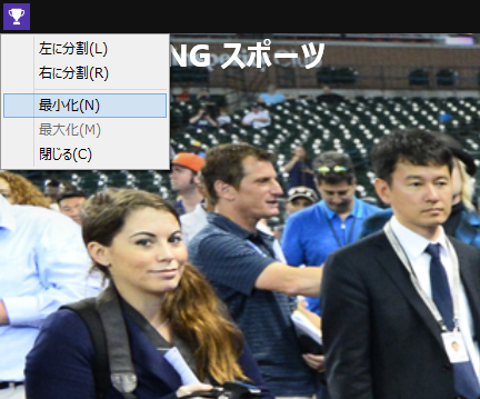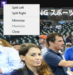 左上のコントロールボックス(という名前だったはず)をクリックするとおなじみのメニューが出ます。ここで「最小化」と「閉じる」が選べますね。実は、「最小化」がアプリを閉じる(中断)で、「閉じる」がアプリが終了なんですが…まあ、英語版の場合は「Minimize」「Close」だから、こっちのほうがいいかも。「最大化」は、画面分割をしている状態だと、全画面に最大化されます。意味合いはあってますね。コントロールボックスをダブルクリックすると、ストアプリが終了できるのは、デスクトップアプリと同じです。分割した状態では「最大化」と「最小化」、「閉じる」しかないので、右に動かしたり左に動かしたりするのはマウスでやることになります。残念…と思ったけど、以下の Alt+Space で動かせます。
