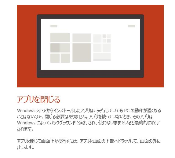 さて、ヘルプを見ると Windows 8.1 の操作があるのですが、残念、アプリの終了方法はドラッグする方法しか書いてありません。これはヘルプのアップデート待ちかと…って、これをアップデートしてたらすごいぞッ!!! 品質的に。4/8 以降のストアアプリのアップデートで、更新されるのかな?