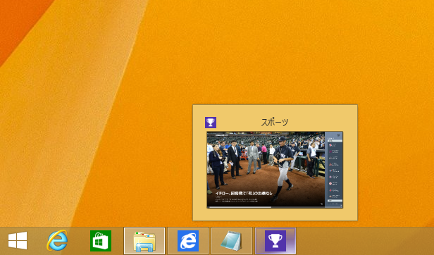 さて、ストアアプリがタスクバーに置かれると何が便利かというと、こんな感じでプレビューが出ます。Update 前は、ストアアプリの場合は左のタスクバー(だっけ?)で確認、デスクトップアプリの場合はタスクバーで確認と分かれていたのですが、Update 以後はタスクバーで一括してプレビューが確認できます。便利ですね。