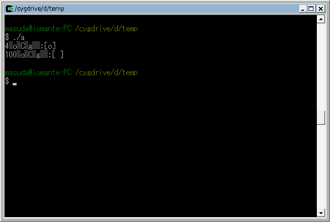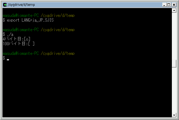 な具合に文字化けします。これは、cygwinをインストールした直後にシェルのLANG 環境変数を設定していない場合に、発生します。
