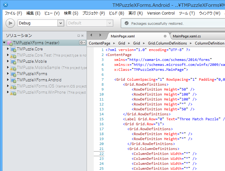 https://github.com/moonmile/TMPuzzleXForms/blob/master/TMPuzzleXForms/TMPuzzleXForms/App.cs 共有プロジェクトの App.cs を書き換えます。MainPage.xaml を共有プロジェクトに追加したので、new MainPage() でページを作成します。コードビハイドの場合は、このあとゴリゴリ内容を書いていますが、ひとまず XAML を書いて Andorid か iOS のシミュレーターで動かすとよいでしょう。