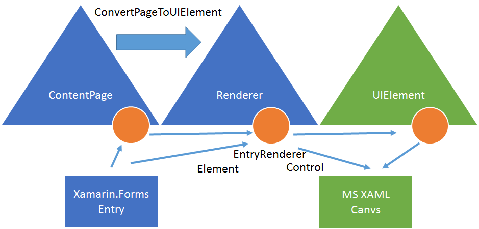• 同時に、Renderer を含む UIElement のツリーを作成し、Xamarin 製と MS 製の対応をツリー状にして保持する。