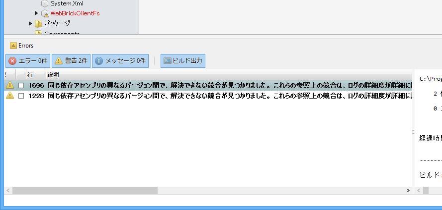 C:/Program Files (x86)/MSBuild/12.0/bin/Microsoft.Common.CurrentVersion.targets(5,5): Warning MSB3277: 同じ依存アセンブリの異なるバージョン間で、解決できない競合が見つかりました。 これらの参照上の競合は、ログの詳細度が詳細に設定されている場合にビルド ログにリストされます。 (MSB3277) (WebBrickClientFs.Android)