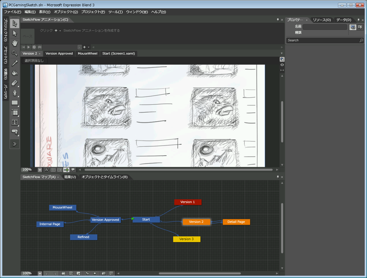 スケッチフローは、簡単にいえば、Web サイトの構想を紙に書く変わりに、電子的に書く、というものです。紙で書いたものをスキャナで取り込んだり、鉛筆で書いたようなスタイルのボタンやリストボックスが用意されています。