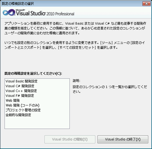 次は、Visual Studio 2010 を起動すると、最初だけ環境設定をします。