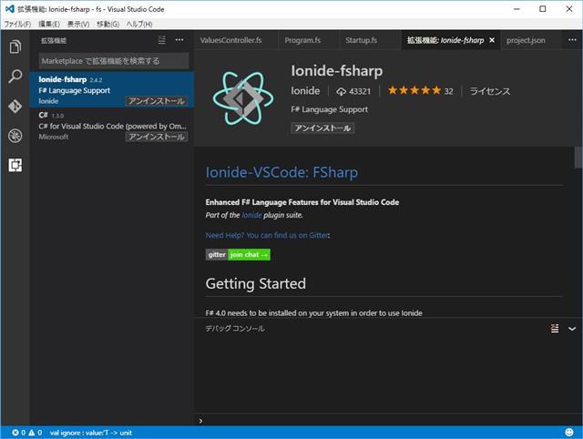 Visual Studio Codeをダウンロード&インストールして「表示」→「Extentions(拡張)」から、「Ionide-fsharp」をインストールします。