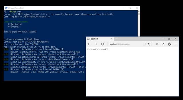 固定の文字列を返すだけとか、計算するだけだとふつうに HttpListener を使って返すだけでも十分だろうという気もしますが、データベースアクセス付け加えたり、認証とかクッキーとかを使ってアクセス制限を考えたり、Controllerクラスのテストなどを考えると、ASP.NET Core を利用した Web API を F# で作るのもアリかな…という無理矢理な発想で :)
