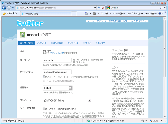 ここのユーザー名を変えてしまうことで、例えば「moonmile」から「tomoaki_masuda」に変更が可能です。これを利用すると、偽アカウントの大量フォロアを、宣伝に有効活用(悪用)できます。