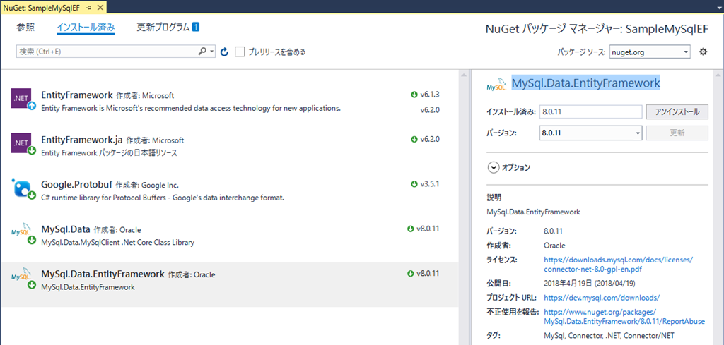 プロジェクトのほうは、MySql.Data.EntityFramework をインストールすれば ok. MySql.Data も一緒にインストールされる。