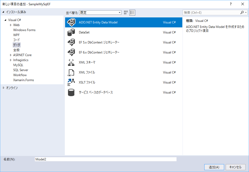 準備ができたら、プロジェクトに「ADO NET Entity Data Model」を追加する。
