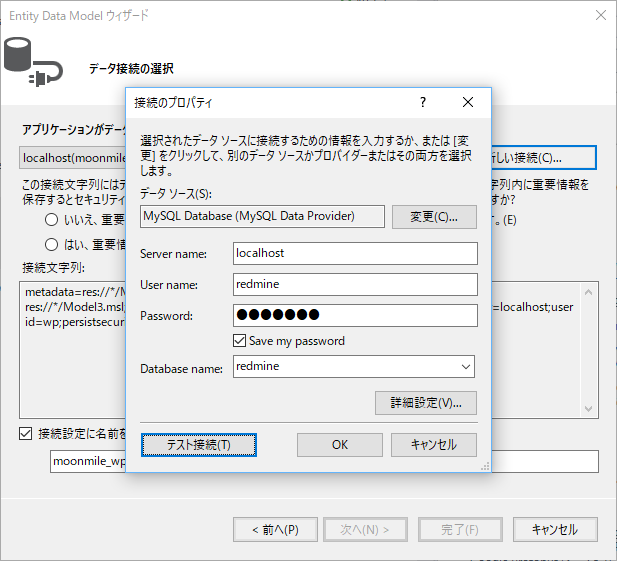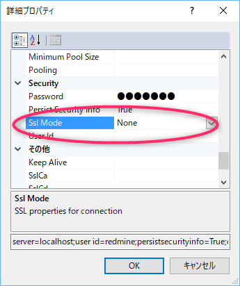 さて、実は Connector/Net 8.0.11 にバグがあるらしく、ここの「詳細設定」を押して、Ssl Mode の値を「None」にしておかないといけない。