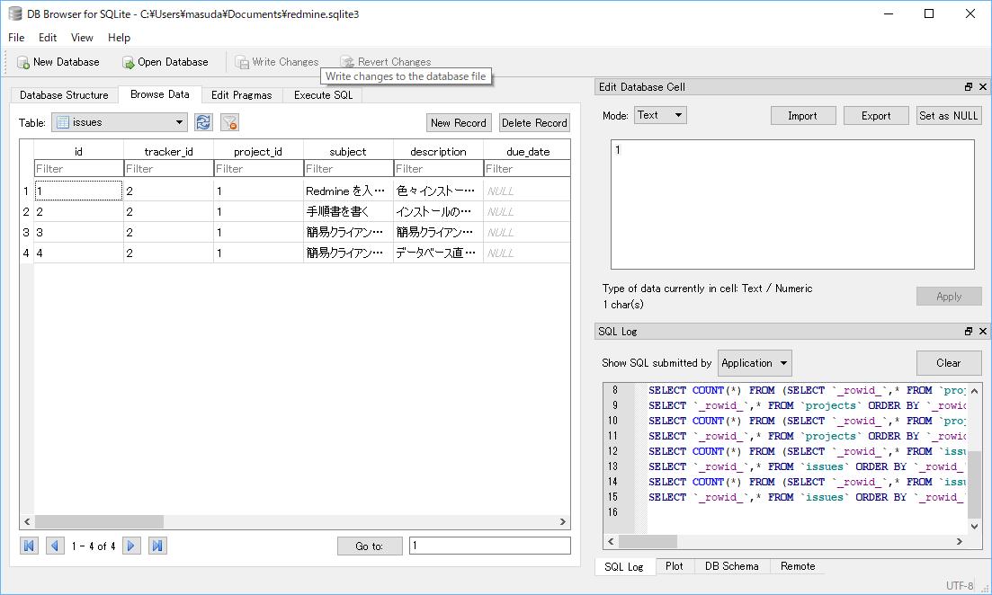 DB Browser for SQLite で中身を確認しておく。ファイル名は「redmine.sqlite3」としている。