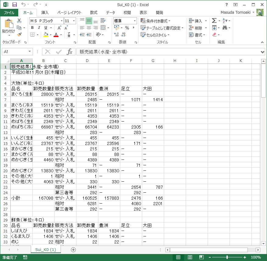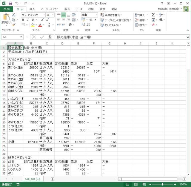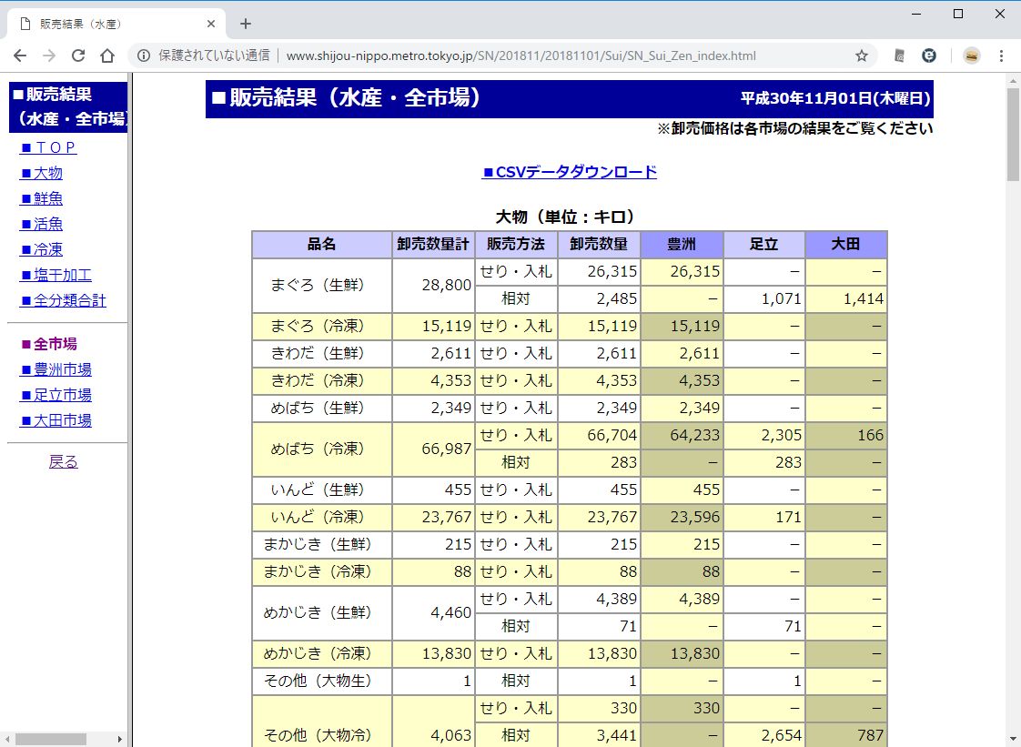 2004年から記録があるので10年以上のデータを取得できます。が、あまり多くても仕方がないのでひとまず5年間分(2013年1月から2018年11月)までの青果と水産のデータをとってきました。