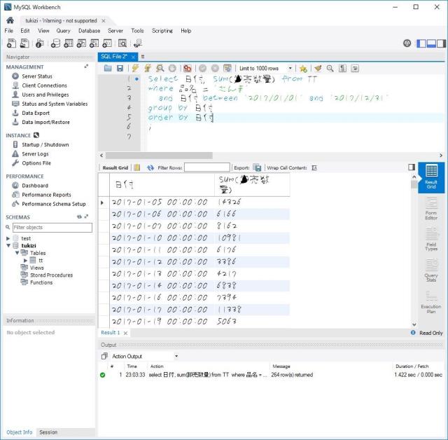 select 日付, sum(卸売数量) from TT where 品名 = 'さんま' and 日付 between '2017/01/01' and '2017/12/31' group by 日付 order by 日付 ;
