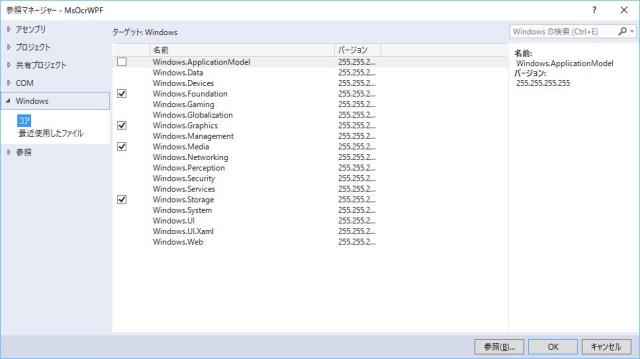 すると参照設定で「Windows」→「コア」というのが使えるようになって、WinRT のアセンブリを指定できるようになる。