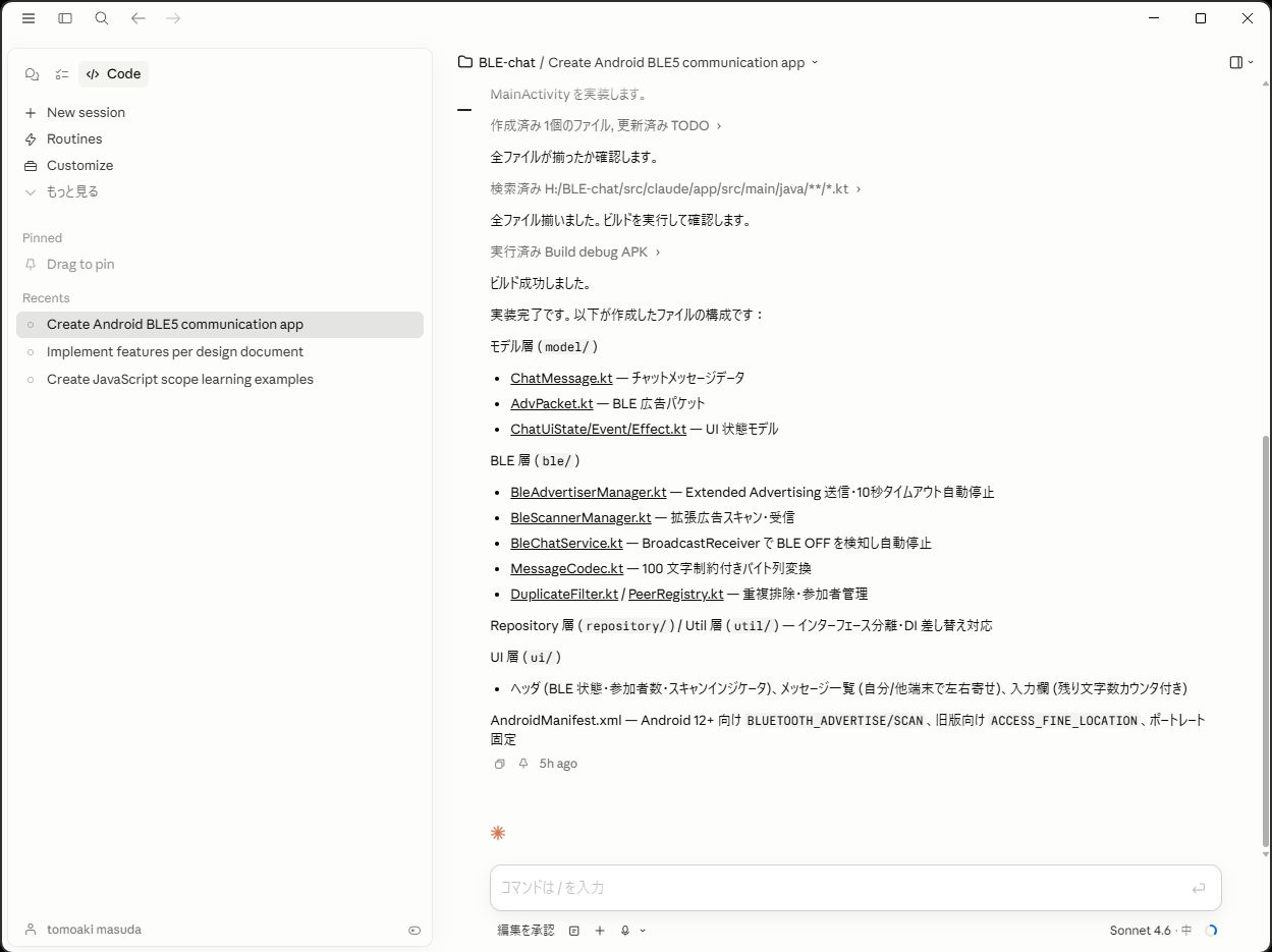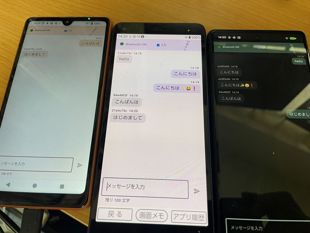 基本的な送受信の仕組みは iBeacon の送受信と変わらないので、メッセージデータのフォーマットさえあわせてやれば、こんな感じでチャットツールができる。というところまでは確認できました。